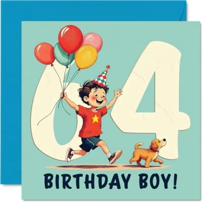 64th Birthday Cards for Men Balloon Boy Happy Card 64 Year Old Man Neighbour Uncle Husband Dad, 145mm Bday Greeting