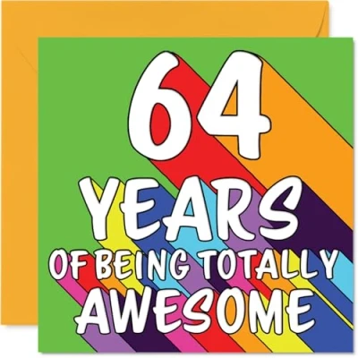 MAKE THEM SMILE WITH THIS UNIQUE BIRTHDAY CARD: This exceptional quality birthday card for him or her shows the design '64 YEARS OF BEING TOTALLY AWESOME'. If you are looking for special birthday greetings cards for Men birthday card then then this happy birthday card is bound to make them smile. Not just for birthday gifts for Men this could also be for Uncle, Grandma, Cousin, Nanny, Sister, Brother, Wife or Dad. WHAT DO YOU GET: The card is printed on one side and BLANK ON THE INSIDE to allow you to write your very own message. The unique fun design is printed on a specially sourced and environmentally responsible board. At 360 microns thick the natural white one-sided gloss board has a quality look and feel. Supplied with a coloured gummed envelope to complement the design and ready to be sealed and sent in the post. Great Uncle birthday cards, Grandma birthday card. DESIGNED FOR WRITING: There is nothing worse than writing inside a card to find that the shiny surface makes the ink smudge. This is why we use a high quality one sided coated board. The uncoated side will absorb more of the ink from your pen to make smudging a thing of the past. 64th Birthday card for Cousin, 64th Birthday card for Nanny, 64th Birthday card for Sister. SIZES: Greeting Card = 145mm x 145mm, Envelope = 155mm x 155mm, Card Thickness = 360 micron. Brother 64th birthday card, birthday cards for Wife, special birthday cards for Dad, 64th birthday card Uncle, Grandma 64th birthday card. MADE AND QUALITY CHECKED IN THE UK: We print and manufacture all our products right here in the UK so you can be sure of a fast turnaround and a product that is expertly made. Using environmentally responsible premium board our card is conscious of the responsible management of the world's forests - perfect birthday cards for Men, fun birthday cards for him, Grandma 64th birthday cards, female birthday cards.