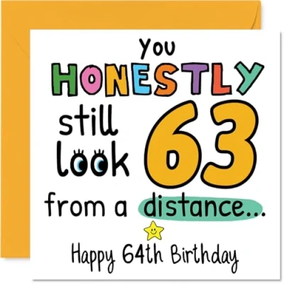 MAKE THEM SMILE WITH THIS UNIQUE BIRTHDAY CARD: This exceptional quality birthday card for him or her shows the design 'You Honestly still look 63 from a distance Happy 64th Birthday'. If you are looking for special birthday greetings cards for Men birthday card then then this happy birthday card is bound to make them smile. Not just for birthday gifts for Men this could also be for Nanny, Auntie, Neighbour, Sister, Wife, Dad, Grandma or Grandad. WHAT DO YOU GET: The card is printed on one side and BLANK ON THE INSIDE to allow you to write your very own message. The unique fun design is printed on a specially sourced and environmentally responsible board. At 360 microns thick the natural white one-sided gloss board has a quality look and feel. Supplied with a coloured gummed envelope to complement the design and ready to be sealed and sent in the post. Great Nanny birthday cards, Auntie birthday card. NO INK SMUDGES: There is nothing worse than writing inside a card to find that the shiny surface makes the ink smudge. This is why we use a high quality one sided coated board. The uncoated side will absorb more of the ink from your pen to make smudging a thing of the past. 64th Birthday card for Neighbour, 64th Birthday card for Sister, 64th Birthday card for Wife. SIZES: Greeting Card = 145mm x 145mm, Envelope = 155mm x 155mm, Card Thickness = 360 micron. Dad 64th birthday card, birthday cards for Grandma, special birthday cards for Grandad, 64th birthday card Nanny, Auntie 64th birthday card. MADE AND QUALITY CHECKED IN THE UK: We print and manufacture all our products right here in the UK so you can be sure of a fast turnaround and a product that is expertly made. Using environmentally responsible premium board our card is conscious of the responsible management of the world's forests - perfect birthday cards for Men, fun birthday cards for him, Auntie 64th birthday cards, female birthday cards.
