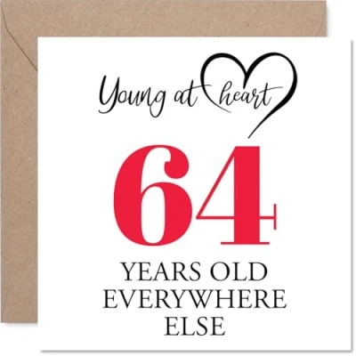 64th Birthday Cards for Women Men Young at Heart Happy Card 64 Year Old Woman Man Nanny Brother Husband Auntie, 145mm Bday Greeting