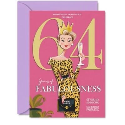 MAKE HER SMILE WITH THIS UNIQUE BIRTHDAY CARD: This exceptional quality birthday card for her shows the design 'Wishing you all the best as you celebrate 64 years of fabulousness'. If you are looking for special birthday greetings cards for Women birthday card then then this happy birthday card is bound to make her smile. Not just for birthday gifts for Women this could also be for Auntie, Grandma, Friend, Wife, Cousin, Nan, Neighbour or Sister. WHAT DO YOU GET: The cards are printed on both sides with the inside print saying 'Have a Luminously Lovely Day' and ample space for your own personal message. The unique design is printed on a specially sourced and environmentally responsible board. At 360 microns thick the natural white one-sided gloss board has a quality look and feel. Supplied with a coloured gummed envelope to complement the design and ready to be sealed and sent in the post. NO INK SMUDGES: There is nothing worse than writing inside a card to find that the shiny surface makes the ink smudge. This is why we use a high quality one sided coated board. The uncoated side will absorb more of the ink from your pen to make smudging a thing of the past. 64th Birthday card for Friend, 64th Birthday card for Wife, 64th Birthday card for Cousin. SIZES: Greeting Card = 127mm x 178mm, Envelope = 130mm x 180mm, Card Thickness = 360 micron. Nan 64th birthday card, birthday cards for Neighbour, cute birthday cards for Sister, 64th birthday card Auntie, Grandma 64th birthday card. MADE AND QUALITY CHECKED IN THE UK: We print and manufacture all our products right here in the UK so you can be sure of a fast turnaround and a product that is expertly made. Using environmentally responsible premium board our card is conscious of the responsible management of the world's forests - perfect birthday cards for Women, fun birthday cards for her, Grandma 64th birthday cards, female birthday cards.