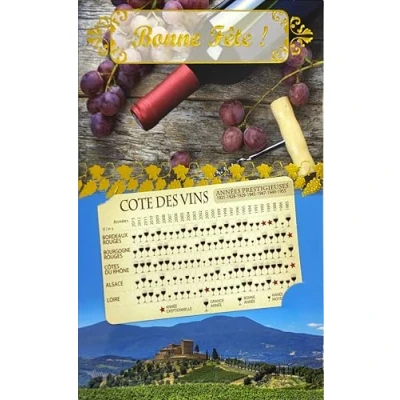Wine themed greeting card: Happy Party card in format 12 x 17.5 cm with elegant illustration of vineyards and grapes, including a detachable painting of French Red Wine Côtes in business card format 9 x 5.5 cm DETACHABLE VINTAGE TABLE: Includes a practical business card format presenting the prestigious years of the wines of Bordeaux, Burgundy, Côtes du Rhône, Alsace and Loire from 1921 to 2013 with indication of exceptional years REFINED AND FESTIVE DESIGN: "Happy Party" decor with gold ornaments, wine bottles, fresh grapes and Tuscan wine landscape, creating a friendly and authentic atmosphere to celebrate wine lovers IDEAL FOR SAINT VINCENT: Perfect to celebrate Saint Vincent, patron saint of winemakers and winegrowers, or to celebrate any name honoring the passion for wine and French viticulture COMPLETE SET READY TO GIVE: Comes with matching envelope, this French creation on quality paper combines greeting card and practical gift for wine enthusiasts