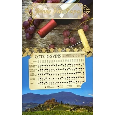 FATHER'S DAY GREETING CARD: Happy Day Dad card in format 12 x 17.5 cm with elegant illustration of vineyards, grapes and wine bottles, perfect for celebrating oenology lover dad DETACHABLE VINTAGE TABLE: Includes a practical business card format 9 x 5.5 cm presenting the prestigious years of French red wines from Bordeaux, Burgundy, Côtes du Rhône, Alsace and Loire from 1921 to 2013 Refined and festive design: "Bonne Fête Papa" decor with gold ornaments, authentic wine landscape and bunches of grapes creating a friendly atmosphere for wine lovers Practical gift for winemakers: The detachable board of Côtes des Vins fits into a wallet and becomes a permanent reference guide to identify the great wine years COMPLETE SET READY TO GIVE: Comes with matching envelope, this French creation on quality paper combines greeting card and useful gift for Father's Day or Saint Vincent
