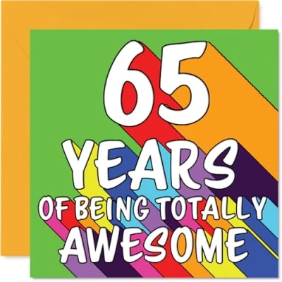 MAKE THEM SMILE WITH THIS UNIQUE BIRTHDAY CARD: This exceptional quality birthday card for him or her shows the design '65 YEARS OF BEING TOTALLY AWESOME'. If you are looking for special birthday greetings cards for Men birthday card then then this happy birthday card is bound to make them smile. Not just for birthday gifts for Men this could also be for Grandma, Cousin, Nanny, Sister, Brother, Wife, Dad or Nan. WHAT DO YOU GET: The card is printed on one side and BLANK ON THE INSIDE to allow you to write your very own message. The unique fun design is printed on a specially sourced and environmentally responsible board. At 360 microns thick the natural white one-sided gloss board has a quality look and feel. Supplied with a coloured gummed envelope to complement the design and ready to be sealed and sent in the post. Great Grandma birthday cards, Cousin birthday card. DESIGNED FOR WRITING: There is nothing worse than writing inside a card to find that the shiny surface makes the ink smudge. This is why we use a high quality one sided coated board. The uncoated side will absorb more of the ink from your pen to make smudging a thing of the past. 65th Birthday card for Nanny, 65th Birthday card for Sister, 65th Birthday card for Brother. SIZES: Greeting Card = 145mm x 145mm, Envelope = 155mm x 155mm, Card Thickness = 360 micron. Wife 65th birthday card, birthday cards for Dad, special birthday cards for Nan, 65th birthday card Grandma, Cousin 65th birthday card. MADE AND QUALITY CHECKED IN THE UK: We print and manufacture all our products right here in the UK so you can be sure of a fast turnaround and a product that is expertly made. Using environmentally responsible premium board our card is conscious of the responsible management of the world's forests - perfect birthday cards for Men, fun birthday cards for him, Cousin 65th birthday cards, female birthday cards.