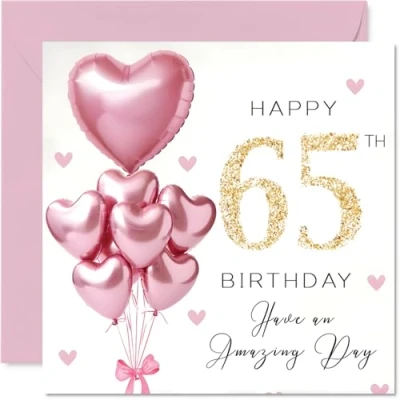 65th Birthday Cards for Women Pink Glitter Balloons Happy Card 65 Year Old Woman Neighbour Auntie Nan Cousin, 145mm Bday Greeting