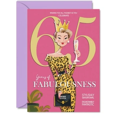 MAKE HER SMILE WITH THIS UNIQUE BIRTHDAY CARD: This exceptional quality birthday card for her shows the design 'Wishing you all the best as you celebrate 65 years of fabulousness'. If you are looking for special birthday greetings cards for Women birthday card then then this happy birthday card is bound to make her smile. Not just for birthday gifts for Women this could also be for Cousin, Nanny, Nan, Sister, Auntie, Neighbour, Wife or Grandma. WHAT DO YOU GET: The cards are printed on both sides with the inside print saying 'Have a Luminously Lovely Day' and ample space for your own personal message. The unique design is printed on a specially sourced and environmentally responsible board. At 360 microns thick the natural white one-sided gloss board has a quality look and feel. Supplied with a coloured gummed envelope to complement the design and ready to be sealed and sent in the post. NO INK SMUDGES: There is nothing worse than writing inside a card to find that the shiny surface makes the ink smudge. This is why we use a high quality one sided coated board. The uncoated side will absorb more of the ink from your pen to make smudging a thing of the past. 65th Birthday card for Nan, 65th Birthday card for Sister, 65th Birthday card for Auntie. SIZES: Greeting Card = 148mm x 210mm, Envelope = 150mm x 212mm, Card Thickness = 360 micron. Neighbour 65th birthday card, birthday cards for Wife, cute birthday cards for Grandma, 65th birthday card Cousin, Nanny 65th birthday card. MADE AND QUALITY CHECKED IN THE UK: We print and manufacture all our products right here in the UK so you can be sure of a fast turnaround and a product that is expertly made. Using environmentally responsible premium board our card is conscious of the responsible management of the world's forests - perfect birthday cards for Women, fun birthday cards for her, Nanny 65th birthday cards, female birthday cards.