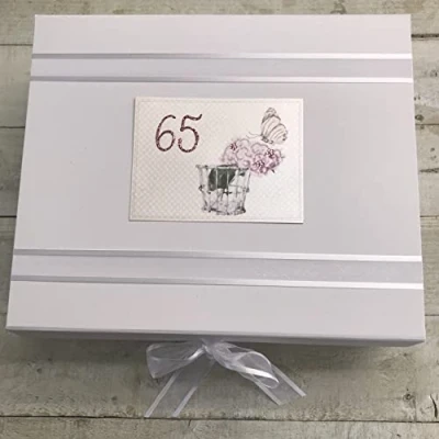 65TH Birthday. Special Occasion. Large Keepsake Box. Peonies & Butterfly Design. Hand Finished by WHITE COTTON CARDS (P65LK)