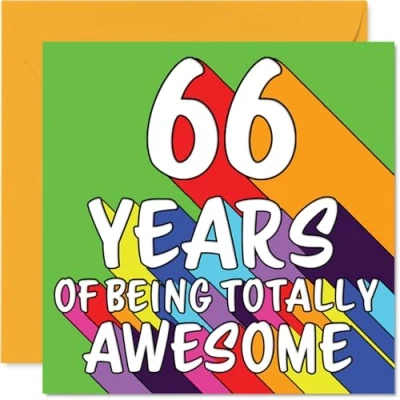 MAKE THEM SMILE WITH THIS UNIQUE BIRTHDAY CARD: This exceptional quality birthday card for him or her shows the design '66 YEARS OF BEING TOTALLY AWESOME'. If you are looking for special birthday greetings cards for Men birthday card then then this happy birthday card is bound to make them smile. Not just for birthday gifts for Men this could also be for Cousin, Nanny, Sister, Brother, Wife, Dad, Nan or Husband. WHAT DO YOU GET: The card is printed on one side and BLANK ON THE INSIDE to allow you to write your very own message. The unique fun design is printed on a specially sourced and environmentally responsible board. At 360 microns thick the natural white one-sided gloss board has a quality look and feel. Supplied with a coloured gummed envelope to complement the design and ready to be sealed and sent in the post. Great Cousin birthday cards, Nanny birthday card. DESIGNED FOR WRITING: There is nothing worse than writing inside a card to find that the shiny surface makes the ink smudge. This is why we use a high quality one sided coated board. The uncoated side will absorb more of the ink from your pen to make smudging a thing of the past. 66th Birthday card for Sister, 66th Birthday card for Brother, 66th Birthday card for Wife. SIZES: Greeting Card = 145mm x 145mm, Envelope = 155mm x 155mm, Card Thickness = 360 micron. Dad 66th birthday card, birthday cards for Nan, special birthday cards for Husband, 66th birthday card Cousin, Nanny 66th birthday card. MADE AND QUALITY CHECKED IN THE UK: We print and manufacture all our products right here in the UK so you can be sure of a fast turnaround and a product that is expertly made. Using environmentally responsible premium board our card is conscious of the responsible management of the world's forests - perfect birthday cards for Men, fun birthday cards for him, Nanny 66th birthday cards, female birthday cards.
