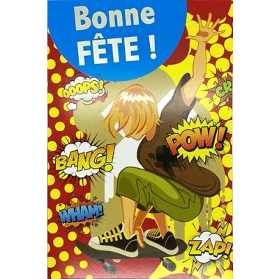 Happy Party Greeting Card: Card in format 12 x 17.5 cm with dynamic illustration comic style manga featuring a young skateboarder, ideal for celebrating the party of a boy or teenager who is passionate about skateboarding ENERGY AND MODERN DESIGN: Colourful decor with graphic effects like comics (Bang, Pow, Wham, Zap) on a red and yellow background with polka dots, creating a festive and urban atmosphere for lovers of sliding sports ILLUSTRATION STYLE CARTOONS: Attractive visual representing a skateboarder in action with his board, in a manga and comic graphic style that will appeal to young people and teenagers COMPLETE SET READY TO GIVE: Comes with matching envelope, this French creation on quality paper offers generous space for your personalised party messages SPECIAL OCCASION: Perfect for celebrating St. Nicholas on December 6th or any name party, this card combines loving message and trendy design loved by young people