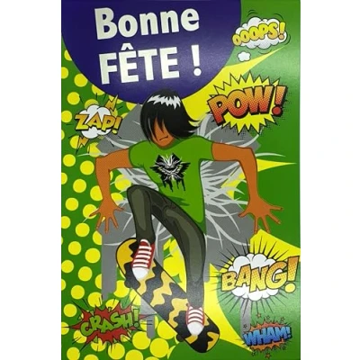 Happy Party Greeting Card: Card in format 12 x 17.5 cm with dynamic illustration comic style manga featuring a young skateboarder, ideal for celebrating the party of a boy or teenager who is passionate about skateboarding ENERGY AND MODERN DESIGN: Colourful decor with graphic effects like comics (Bang, Pow, Wham, Zap, Crash) on a multi-coloured background with yellow polka dots, creating a festive and urban atmosphere for lovers of sliding sports ILLUSTRATION STYLE CARTOONS: Attractive visual representing a skateboarder in action with his board, in a manga and comic graphic style that will appeal to young people and teenagers COMPLETE SET READY TO GIVE: Comes with matching envelope, this French creation on quality paper offers generous space for your personalised party messages SPECIAL OCCASION: Perfect for celebrating St. Nicholas on December 6th or any name party, this card combines loving message and trendy design loved by young people