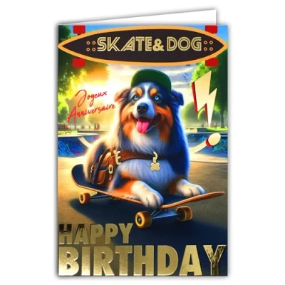 67 1269 Birthday Card Dog Skateboard Text in Shiny Gold and Envelope 12 x 17.5 cm Australian Shepherd Pet with Cap Collar Medal Skatepark Walk a Park