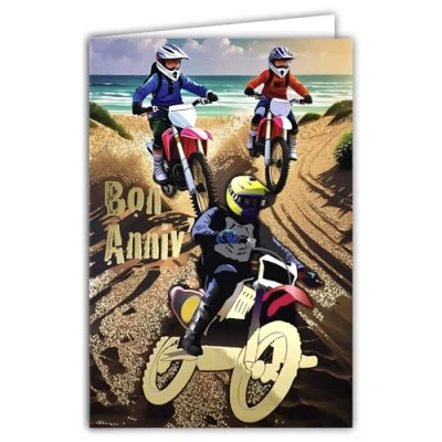 67 1285 Happy Birthday Card Motorcycle Motocross Child Teenager Race in Sand Dunes Shiny Gold Youth Illustration with White Envelope Size 12 x 17.5 cm Made France