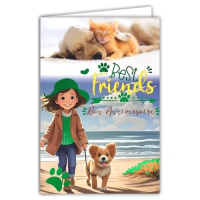 67 1295 Happy Birthday Card for Girl Dog Puppy Kitten Pets Best Friends Walk to the Sea Beach Hat Glossy Green with White Envelope Size 12 x 17.5 cm Made in France