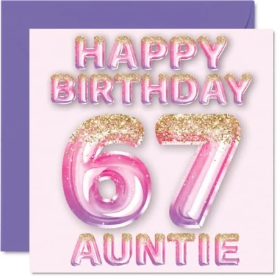 67th Birthday Card for Auntie Pink & Purple Glitter Balloons Happy Cards 67 Year Old Aunt Aunty from Nephew Niece, 145mm x Bday Greeting Gift