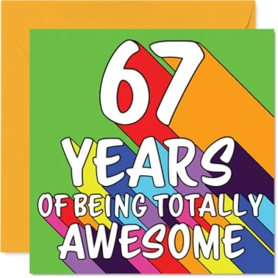 MAKE THEM SMILE WITH THIS UNIQUE BIRTHDAY CARD: This exceptional quality birthday card for him or her shows the design '67 YEARS OF BEING TOTALLY AWESOME'. If you are looking for special birthday greetings cards for Men birthday card then then this happy birthday card is bound to make them smile. Not just for birthday gifts for Men this could also be for Nanny, Sister, Brother, Wife, Dad, Nan, Husband or Grandad. WHAT DO YOU GET: The card is printed on one side and BLANK ON THE INSIDE to allow you to write your very own message. The unique fun design is printed on a specially sourced and environmentally responsible board. At 360 microns thick the natural white one-sided gloss board has a quality look and feel. Supplied with a coloured gummed envelope to complement the design and ready to be sealed and sent in the post. Great Nanny birthday cards, Sister birthday card. DESIGNED FOR WRITING: There is nothing worse than writing inside a card to find that the shiny surface makes the ink smudge. This is why we use a high quality one sided coated board. The uncoated side will absorb more of the ink from your pen to make smudging a thing of the past. 67th Birthday card for Brother, 67th Birthday card for Wife, 67th Birthday card for Dad. SIZES: Greeting Card = 145mm x 145mm, Envelope = 155mm x 155mm, Card Thickness = 360 micron. Nan 67th birthday card, birthday cards for Husband, special birthday cards for Grandad, 67th birthday card Nanny, Sister 67th birthday card. MADE AND QUALITY CHECKED IN THE UK: We print and manufacture all our products right here in the UK so you can be sure of a fast turnaround and a product that is expertly made. Using environmentally responsible premium board our card is conscious of the responsible management of the world's forests - perfect birthday cards for Men, fun birthday cards for him, Sister 67th birthday cards, female birthday cards.