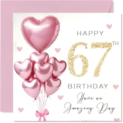 67th Birthday Cards for Women Pink Glitter Balloons Happy Card 67 Year Old Woman Sister Wife Auntie Neighbour, 145mm Bday Greeting