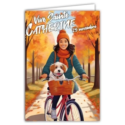 MODERN DESIGN: Illustrated greeting card with a warm autumn scene, representing a bike ride with a dog in a decoration of orange leaves Practical size: Dimensions: 12 x 17 cm, comes with a matching white envelope for easy shipping SPECIAL OCCASION: Perfect to celebrate Saint Catherine on November 25th, an important French tradition Made in France. Product entirely designed and manufactured in France, guaranteeing premium quality PERSONALIZATION: Ideal card for writing a personal message to a young woman celebrating her Saint Catherine