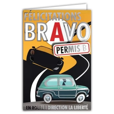 68 5003 Bravo Congratulations Permit B Driving Car Card Glossy Silver with Envelope 12 x 17.5 cm Passed Examination Code 18 Years Majority Road Freedom Creation Print Made in France
