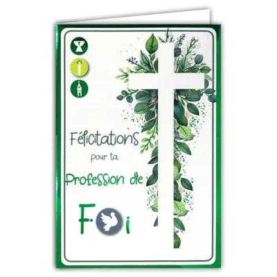 68 6601 Congratulations on Your Profession of Faith Card for Boy Girl Christian Cross Catholic Foliage Glossy Green with White Envelope 12 x 17.5 cm Made in France