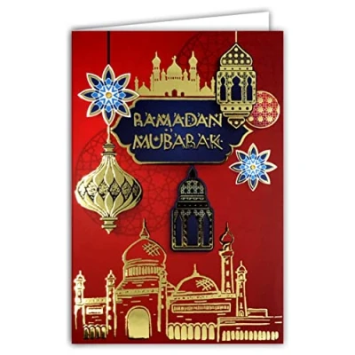 68 9001 AFIE Ramadan Mubarak Card in Shiny Gold Muslims Month Saint Fastness Laylat al Qadr Eid el Fitr Islamic Party 5 Pillars Mosque Lantern Ramadanese White Envelope Size 17.5 x 12 cm