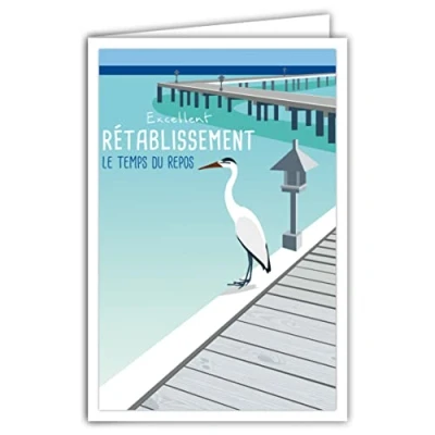 69 4347 Card The Time of Rest Prompt Good Excellent Recovery Envelope Mini Poster Format 17 x 11.5 cm Bird Crane White Pontoon Wood Water Sea Paradise Retro Vintage Blue