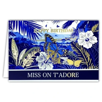 SOPHISTICATED DESIGN: Luxurious birthday card adorned with butterflies, hibiscus flowers and tropical foliage with shiny gilding on a deep blue background and the message "Happy BirthDay Miss On t'adore" GENEROUS SIZE: 12 x 17.5cm size provides ample space to personalize your warmest and affectionate birthday wishes LUXURY COLLECTION: Premium card with vibrant gold finishes and refined design featuring floral and natural motifs for a prestigious presentation ENVELOPE INCLUDED: Comes with a matching white envelope for a neat and complete presentation, ready to give as a gift Made in France. High quality card created, printed and made in France with premium materials, guaranteeing exceptional craftsmanship