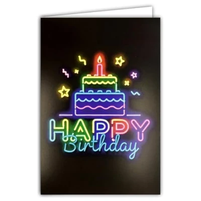69 8120 Neon Happy Birthday Card with Envelope 12 x 17.5 cm Cake Lit Candle Stars White Interior for Writing Real Inks Created and Made in France