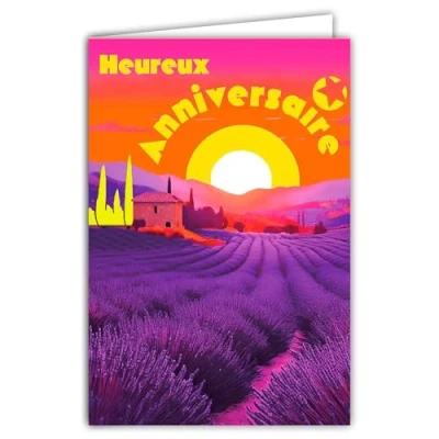69 8157 Happy Birthday Fluorescent Postcard Pretty Fields of Lavender Beautiful Landscape the South under Lazy Sun Rest with White Envelope 12 x 17.5 cm Made in France