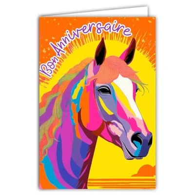 69 8160 Happy Birthday Card Pony Horse Multi Coloured Pop Art Gift Idea for Children Teenagers We Wish You Wishes With White Envelope 12 x 17.5 cm Made in France