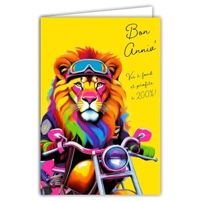 69 8174 Neon Card Happy Birthday Screw Bottom and Enjoys 200% Lion Biker Motorcycle Sunglasses Pop Art Style Multi Coloured with White Envelope 12 x 17.5 cm Made in France