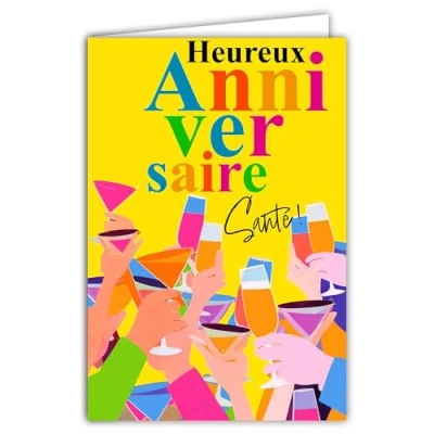 69 8180 Happy Birthday Health Card Hands in the Air Toasting Flutes Champagne Cocktails Pop Art with White Envelope 12 x 17.5 cm Made France