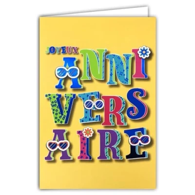 69 9027 Happy Birthday Card + Envelope 12 x 17.5 cm Flowers Sunglasses Carnival Hippies Boho 1960s Sixties Words Letters in Shiny Blue