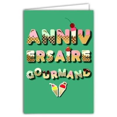 69 9028 Happy Birthday Card with Envelope 12 x 17.5 cm Ice Cream Cone Letters Words Orange Copper Shiny Strawberry Cherry Red Fruits Design Made in France