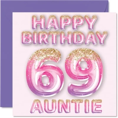 69th Birthday Card for Auntie Pink & Purple Glitter Balloons Happy Cards 69 Year Old Aunt Aunty from Nephew Niece, 145mm x Bday Greeting Gift