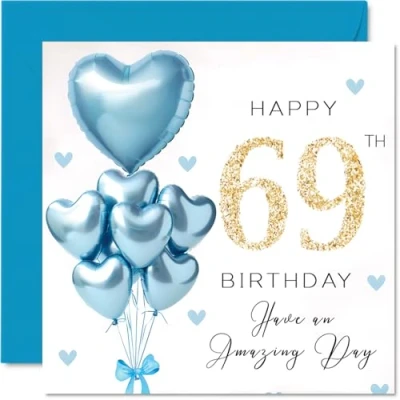 69th Birthday Cards for Men Blue Glitter Balloons Happy Card 69 Year Old Man Neighbour Cousin Grandad Dad, 145mm Bday Greeting