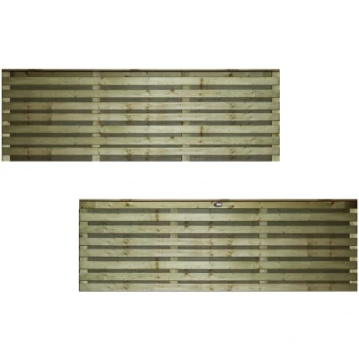 General description The 6ft x 2ft ROMAD Double Horizontal Venetian Slatted Fence Panel is a stylish and modern addition to any garden. This double-slatted design features horizontal laths that provide full privacy while allowing light and air to flow through, making it suitable for boundary fencing, screening, or partitioning. Manufactured from rough-sawn timber, these panels are robust and designed to withstand strong winds. Technical specifications Width: 6ft (183cm) Optional Heights: 1ft (30cm), 2ft (60cm), 3ft (90cm), 4ft (120cm), 5ft (150cm), 6ft (180cm) Slat dimensions: approximately 47mm x 14mm Void between front and back slats: 14mm Gap between horizontal slats: 20mm to 30mm Other information Pressure treated using Tanalith E Timber may contract and expand in different weather conditions Recommended to wait 6-8 weeks before painting to allow treatment to dry