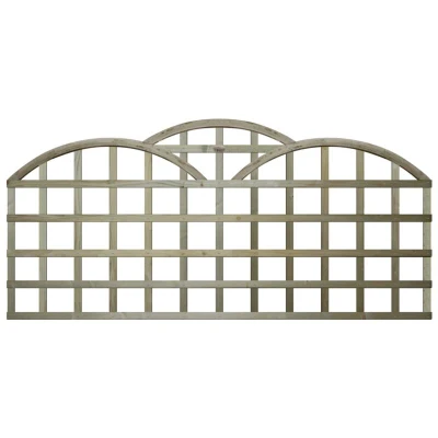 General description This 6ft x 2ft Triple Dome Standard Trellis Panel features a distinctive Art Deco-inspired design, creating a graceful cloud-like effect that enhances any garden space. Manufactured from high-quality rough-sawn timber, this trellis is not only visually appealing but also durable, with arched bows crafted from the same timber as the rest of the panel. It is versatile enough to be used as a panel topper, a stand-alone dividing panel, or wall-mounted for climbing plants. Technical specifications Dimensions: 6ft (183cm) wide Height including domes: 2ft (60cm) + 25cm (for domes) = 2ft 7in (approximately 81cm) Square trellis holes: between 100-120mm Domes height: approximately 26cm Available heights: 1ft (30cm), 2ft (60cm), 3ft (90cm), 4ft (120cm), or 5ft (150cm) Shoulder height for each option: 56cm, 86cm, 116cm, 146cm, or 176cm respectively Other information Constructed from tanalised pressure-treated timber for long-lasting protection against rot and decay Timber is a