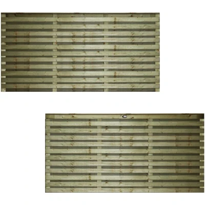 General description The 6ft x 3ft ROMAD Double Horizontal Venetian Slatted Fence Panel is a stylish and modern addition to any garden. This double-slatted design features horizontal laths that provide privacy while allowing light and air to flow through, making it suitable for boundary fencing or as a decorative screen. Manufactured from rough-sawn timber, these panels are pressure treated for durability and weather resistance. Technical specifications Width: 6ft (183cm) Optional Heights: 1ft (30cm), 2ft (60cm), 3ft (90cm), 4ft (120cm), 5ft (150cm), 6ft (180cm) Slat dimensions: approximately 47mm x 14mm Void between front and back slats: 14mm Gap between horizontal slats: approximately 20mm to 30mm Installation Panels are designed for easy installation as boundary fencing or screening. Finished with a capping rail on top to protect against water ingress. Usage Ideal for creating privacy screens or partitioning areas in your garden. Allows airflow, reducing the risk of damage from