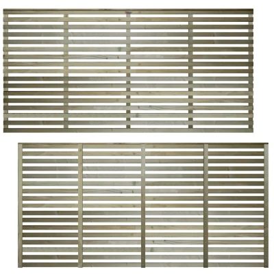 General description The Premier Garden Vogue Trellis Panel features a sleek, modern design with a stylish flat-capped top. Crafted from premium rough-sawn timber, this trellis is available in various heights and can be used as a panel topper, freestanding divider, or wall-mounted climbing frame. The horizontal laths are elegantly arranged, creating a clean aesthetic while allowing air to flow through, reducing wind damage. Technical specifications Width: 6ft (183cm) Optional Heights: 0.5ft (15cm), 1ft (30cm), 1.5ft (45cm), 2ft (60cm), or 3ft (90cm) Spacing between slats: Approximately 20mm Material: Rough-sawn timber Treatment: Tanalised pressure-treated for enhanced durability Installation Designed for slotted posts or to position a wooden post between panels to avoid visual differences when placed side by side. Usage Ideal for garden screening, supporting climbing plants, or sectioning spaces. Durable and low maintenance, built to withstand the elements year-round. Other information