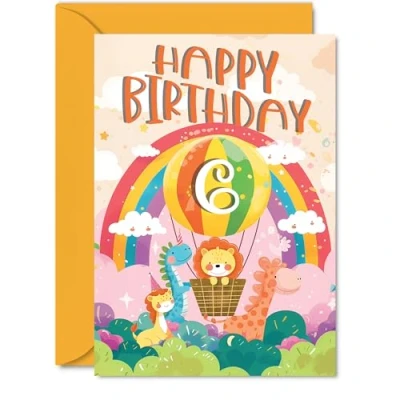 6th Birthday Card Girls Boys Hot Air Balloon Rainbow Happy for 6 Year Old Girl Boy Kids, 5x7 Inch Six Sixth Bday Animal Greeting Cards