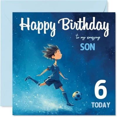 MAKE HIM SMILE WITH THIS UNIQUE BIRTHDAY CARD: This exceptional quality birthday card for him shows the design 'Happy Birthday To My Amazing Son 6 Today'. If you are looking for special birthday greetings cards for Boys birthday card then then this happy birthday card is bound to make him smile. Not just for birthday gifts for Boys this could also be for Grandson, Great Nephew, Brother, Son, Godson, Step Son, Nephew or Cousin. WHAT DO YOU GET: The card is printed on one side and BLANK ON THE INSIDE to allow you to write your very own message. The unique fun design is printed on a specially sourced and environmentally responsible board. At 360 microns thick the natural white one-sided gloss board has a quality look and feel. Supplied with a coloured gummed envelope to complement the design and ready to be sealed and sent in the post. Great Grandson birthday cards, 6th birthday card, Great Nephew birthday card. NO INK SMUDGES: There is nothing worse than writing inside a card to find that the shiny surface makes the ink smudge. This is why we use a high quality one sided coated board. The uncoated side will absorb more of the ink from your pen to make smudging a thing of the past. 6th Birthday card for Brother, 6th Birthday card for Son, 6th Birthday card for Godson. SIZES: Greeting Card = 145mm x 145mm, Envelope = 155mm x 155mm, Card Thickness = 360 micron. Step Son 6th birthday card, birthday cards for Nephew, cute birthday cards for Cousin, 6th birthday card Grandson, Great Nephew 6th birthday card. MADE AND QUALITY CHECKED IN THE UK: We print and manufacture all our products right here in the UK so you can be sure of a fast turnaround and a product that is expertly made. Using environmentally responsible premium board our card is conscious of the responsible management of the world's forests - perfect birthday cards for Boys, fun birthday cards for him, Great Nephew 6th birthday cards, female birthday cards.