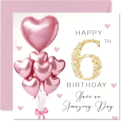 6th Birthday Cards for Girls Pink Glitter Balloons Happy Card 6 Year Old Girl Great Niece Goddaughter Granddaughter, 145mm Bday Greeting