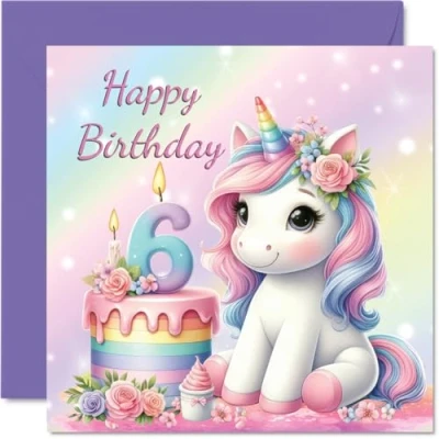 6th Birthday Cards for Girls Unicorn Cake Happy Card 6 Year Old Girl Great Niece Granddaughter Daughter, 145mm Bday Greeting