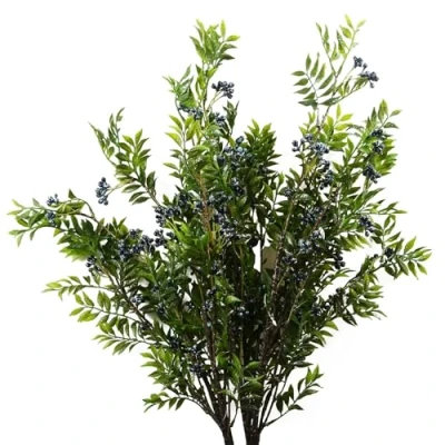 Pack of 6 stems, ideal for creating arrangements. Pack of 6 stems of realistic artificial Nandina foliage with blue berries. These meticulously crafted pieces feature lifelike plastic leaves that mimic the natural beauty of Nandina foliage, complemented by vibrant blue berries that add a pop of color to any display. The wired stems allow for easy shaping and positioning, making it simple to customize the sprays to fit your desired aesthetic. Perfect for combining with other artificial stems, these versatile sprays are ready to enhance your home decor, event arrangements, or seasonal displays, providing a long-lasting and maintenance-free alternative to fresh flowers. Each stem measures 70cm from end to end but can easily be trimmed down to a shorter size with a pair of wire cutters. Plastic leaves. Leaf Design UK product.