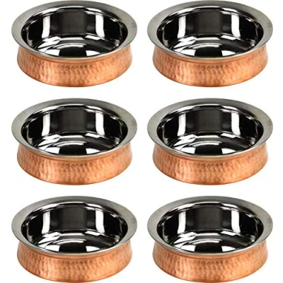 6X Premium Hammered Copper & Stainlees Steel Serving Handi Biriyani Dish Bowl (13cm)