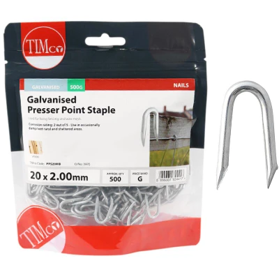 General description Timco Galvanised Presser Point Staples are designed for quick and easy fastening of wire mesh and fencing to timber posts. Their U shape makes them ideal for fencing applications, providing medium-duty rust protection. Technical specifications Dimensions: 20 x 2.00mm Weight: 500g Suitable for medium duty rust protection