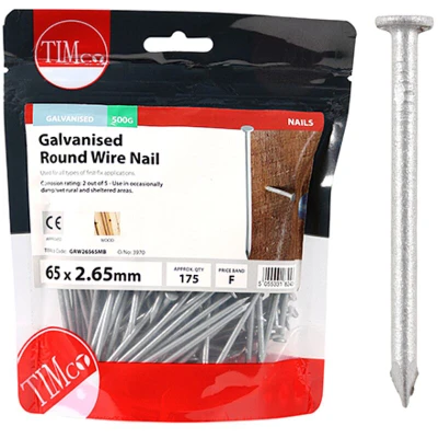 General description Timco Galvanised Round Wire Nails are designed for creating a strong bond between pieces of wood, making them ideal for rough carpentry where the nails will not be visible. These nails are suitable for medium duty rust protection and are perfect for clamping. Technical specifications Dimensions: 65 x 2.65 mm Weight: 500 g Service Class: Complies with Service Class 2 Eurocode: Complies with Eurocode 5 Other information Available in various sizes: 40 x 2.65 mm, 50 x 2.65 mm, 65 x 3.35 mm, 75 x 3.75 mm, 100 x 4.50 mm, 125 x 5.60 mm, 150 x 6.00 mm Available in different pack sizes: 1 kg, 2.5 kg, 25 kg