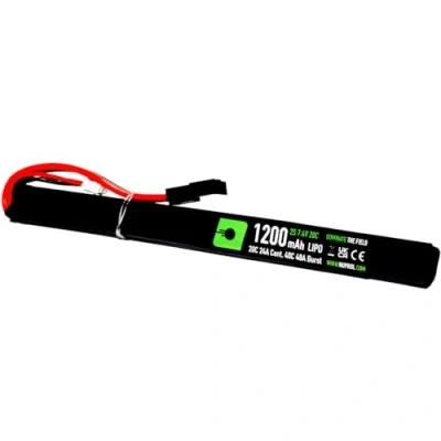STATS - LiPo | 7.4v | 1200 mAh | 20C/40C @ 24A/48A (Cont/Burst) - Airsoft AEGs use the "Burst" flow rate to start the motor, and then the "Cont" flow rate to provide continuous discharge (check your owners manual to ensure the battery purchased meets the minimum flow rate (C) of your AEG) - this battery provides approximately 3 minutes of continuous discharge before running flat LITHIUM POLYMER - LiPo batteries have an excellent size/weight to capacity ratio, allowing you to fire more shots with a smaller battery. LiPo batteries can be recharged at any charge level without damaging the overall capacity of the battery. LiPo batteries should not be "run-flat", as this can damage the battery and effect overall charge ability. LiPo batteries MUST be charged with a LiPo Balance Charger. LiPo batteries should always be charge in a fire-retardant Safe-Charging-Bag SLIM STICK - long & skinny, this battery is designed to fit in the upper receiver of rear mounted AK Airsoft Replicas. Always check the dimensions of the battery vs the battery compartment to ensure compatability MINI TAMIYA - this battery is suitable for Airsoft Replicas using a Mini-Tamiya battery connector QUALITY CONTROL - NP Power batteries are produced at an ISO 9000 Quality Control accredited manufacturing plant and shipped at an optimal charge rate of ≥60% to protect against degradation when in transport/ storage
