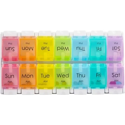 7-day pill box with 2 compartments per day - AM/PM Push button release for easy access to medication Perfect for those who take multiple medications throughout the day Compact and easy to carry, great for travel Made of high-quality BPA free materials for durability and long-lasting use Never miss a dose of your medication again