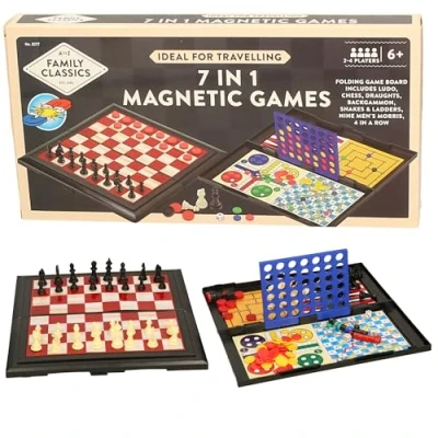 VERSATILE GAMEPLAY: Complete 7-in-1 magnetic board game set featuring Chess, Draughts, Ludo, Snakes & Ladders, Backgammon, Nine Men's Morris, and 4-in-a-Row TRAVEL-FRIENDLY DESIGN: Compact folding game board with magnetic pieces ensures secure gameplay during travel and easy storage FAMILY ENTERTAINMENT: Suitable for 2-4 players aged 6 and above, perfect for family game nights and social gatherings QUALITY CONSTRUCTION: Durable board with magnetic components prevents piece displacement during play, featuring classic red and cream chessboard design COMPLETE SET: Includes all necessary gaming pieces, dice, and boards for seven different classic games in one convenient package, Manufacturer: Atoz Family Classics